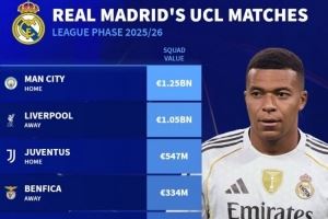 皇马本赛季欧冠对手身价:曼城12.5亿欧最高,利物浦10.5亿欧次席